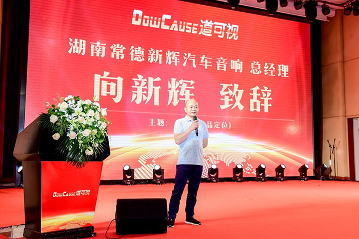 湖南常德新輝汽車音響總經(jīng)理向新輝上臺(tái)發(fā)言,他以自身多年門店運(yùn)營(yíng)經(jīng)驗(yàn),為嘉賓帶來“門店產(chǎn)品定位”的主題分享。